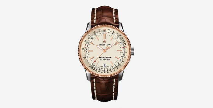 Lebih dari 65 tahun, Breitling Navitimer sudah menjadi jam tangan pilot yang paling dipandang di dunia. Dengan 38 mm stainless steel case, jam tangan ini menyediakan ukuran yang sempurna untuk laki-laki maupun perempuan. Model ini juga tersedia dengan dial perak dalam versi stainless steel, dengan 18 karat red gold bezel dan alligator leather strap berwarna cokelat. Dengan estetikanya, Navitimer 1 Automatic 38 menjadi salah satu jam tangan dalam keluarga Breitling yang paling dikagumi oleh audiens masa kini.