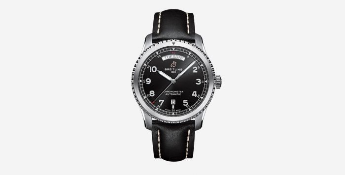 Navitimer 8 Day & Date menampilkan hari, tanggal, beserta waktu secara jelas. Hari ditunjukkan pada posisi jam 12, sementara tanggal ditempatkan pada jam 6 secara ideal. Jam tangan ini ditenagai oleh Breitling Caliber 45 yang menawarkan daya lebih dari 40 jam. 41 mm stainless steel case yang hadir dilengkapi dengan leather strap.