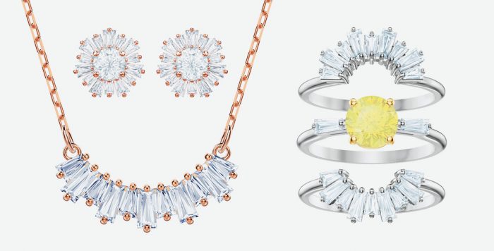 Cerahkan harinya dengan koleksi Sunshine yang digambarkan dengan siluet sunburst yang berpadu dengan baguette-cut Swarovski crystal. Lini ini menampilkan ring set yang dapat ditumpuk, oversized stud, dan liontin besar dengan panjang yang dapat diatur.