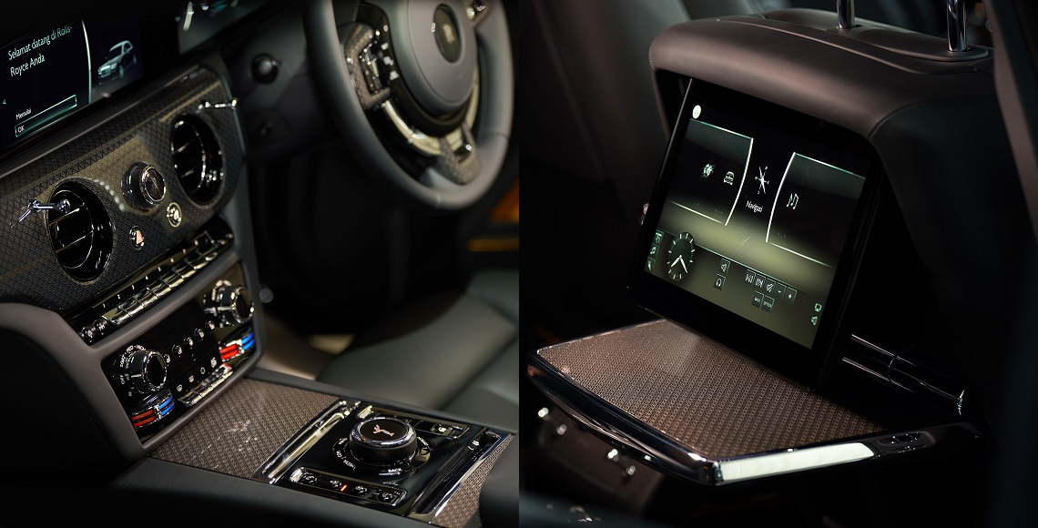 Interior mobil ini pun tampil exquisite melalui material Technical Fibre dengan weaving nan kompleks namun subtle berpola berlian buatan craftspeople Rolls-Royce. Simbol ketakterhinggaan dari bidang matematika, Lemniscate, juga dapat dihadirkan bila dikehendaki klien. Sementara itu, desain timepiece yang menjadi elemen terintegrasi dari interior mobil ini tampil minimalis sebagai perwujudan estetika post-opulent. Hanya ujung jarum jam serta marker 12, 3, 6, dan 9 yang tampak dan mendapat subdued chrome finish sehingga membawa efek elegan yang dramatis. Bespoke Audio System pada mobil ini menciptakan studio quality sound dalam kabin yang mampu mengisolasi external noise.