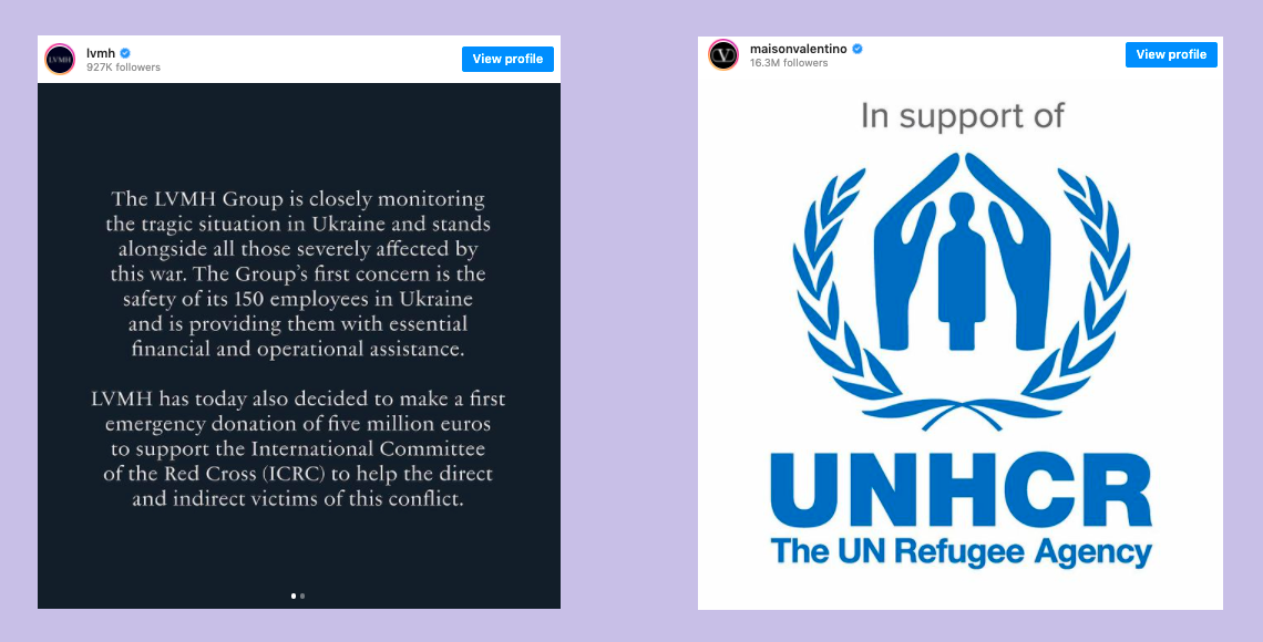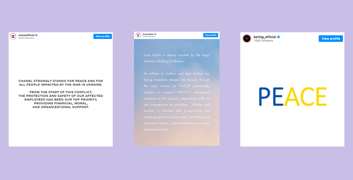 Kering, global luxury giant yang mencakup Saint Laurent, Bottega Veneta, dan Gucci, memberi statement dengan kata “Peace” dalam warna biru dan kuning ala bendera Ukraina di media sosialnya, bersamaan dengan pernyataan bahwa mereka berkontribusi pada upaya kemanusiaan untuk membawa bantuan dan dukungan untuk para pengungsi Ukraina.