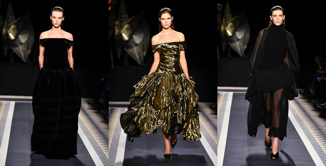 Bentuk penghormatan sang desainer kepada Lanvin nyata terlihat pada adopsi forma gaun Robe de Style berdesain dropped waist yang dibuatnya off-shoulder dalam rona deep gold. A cool move! Desainer lulusan Central Martins dengan pengalaman di Sonia Rykiel, Louis Vuitton, Nina Ricci, Oscar de la Renta, dan Balenciaga ini telah membuka babak baru Lanvin.