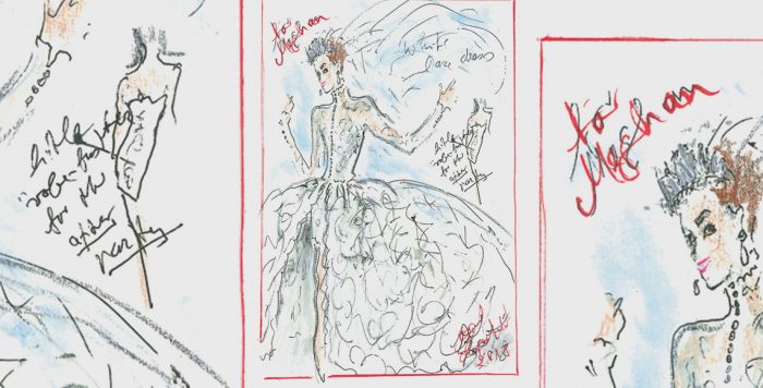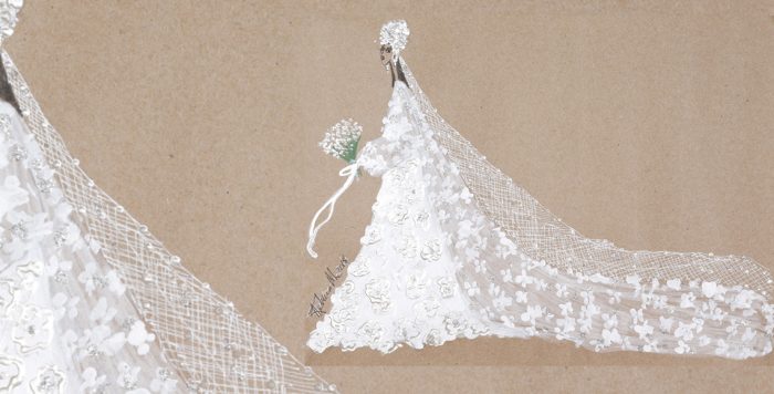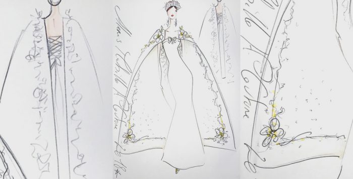 Karl Lagerfeld menggambar gaun dengan rok yang bervolume megah, disertai dengan bodice berleher tinggi dan tambahan tiara (sebagai sebuah something borrowed) untuk rambutnya.