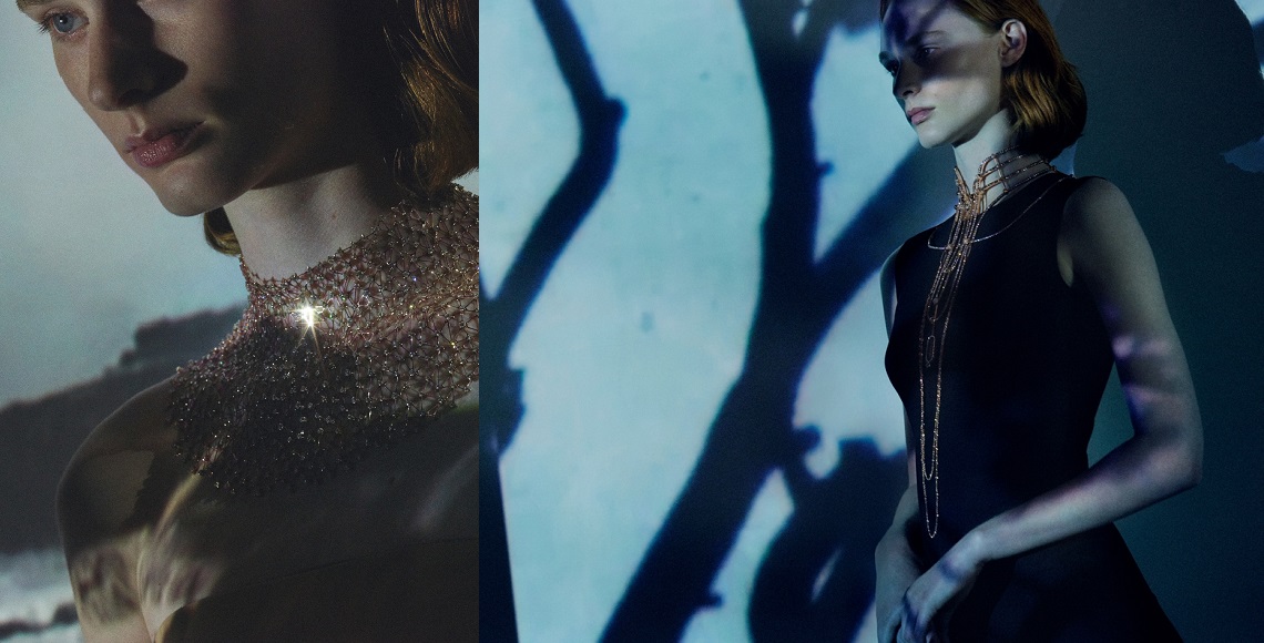 “The jewellery is closer than ever to the body itself. The pieces fit closely around the finger, around the neck, around the wrist. I wanted to return to this symbiosis: to be at one with the skin,” jelas Hardy. Salah satu manifestasi dari pemahaman tersebut adalah pemilihan warna-warna permata yang lembut. Perihal palet batu-batu permata yang digunakan, Hardy mengataan, “I wanted to use a range of gemstones in colours close to skin tone. I looked for flesh colours, shades specific to the complexion, the lips, or the iris.” Warna-warna tersebut tampil kontras terhadap nuansa lavish dari dominasi rose gold yang mengaksentuasi keindahan tiap warna kulit.