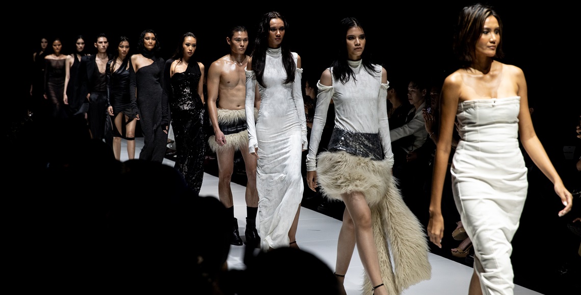Bahu yang dipertegas muncul dalam kreasi tailoring yang dikenakan Ichsan Rindengan di mana sisi boxy dibaurkan sengan kesan sharp. Drama – something that he loves – mewujud pada gigantic lapel pada sebuah long coat, ataupun lewat penggunaan faux Mongolian fur yang membawa romansa vintage glamour pada desain kontemporer. Baik pada little black dresses maupun long black gowns, garis-garis asimetri membangun mood yang daring pada elongated silhouette dengan pengaplikasian teknik-teknik lingerie corsetry.