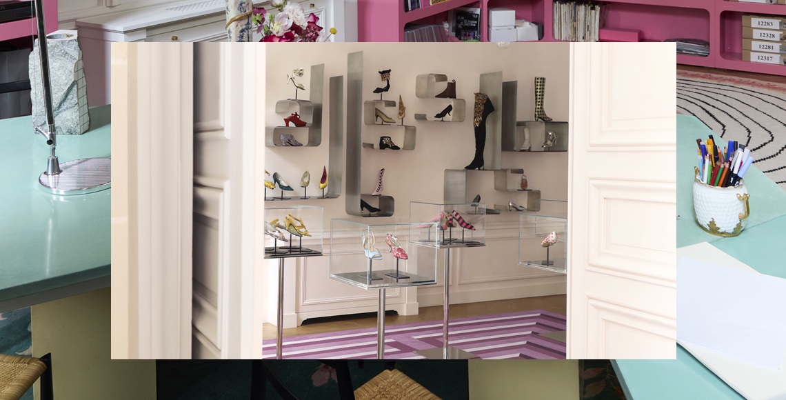 Ruang kerja direktur kreatif Gherardo Felloni tampil eklektik dari perpaduan warna hijau dan pink. Sentuhan personalnya hadir dari potret anjing dari abad ke-18 hingga ukiran seni pahat bertemakan lebah. Di Le Salon de l’Héritage, pengunjung dapat menelusuri perjalanan kreatif Roger Vivier dari era 1950-an hingga 1990-an berdampingan dengan potret para muse. Display tersebut berdampingan dengan furnitur vintage, rak baja Xavier Feal, kursi Barcelona karya Mies van der Rohe, serta karpet “Labyrinth” karya Vincent Darré yang penataannya dikurasi oleh Inès de La Fressange.