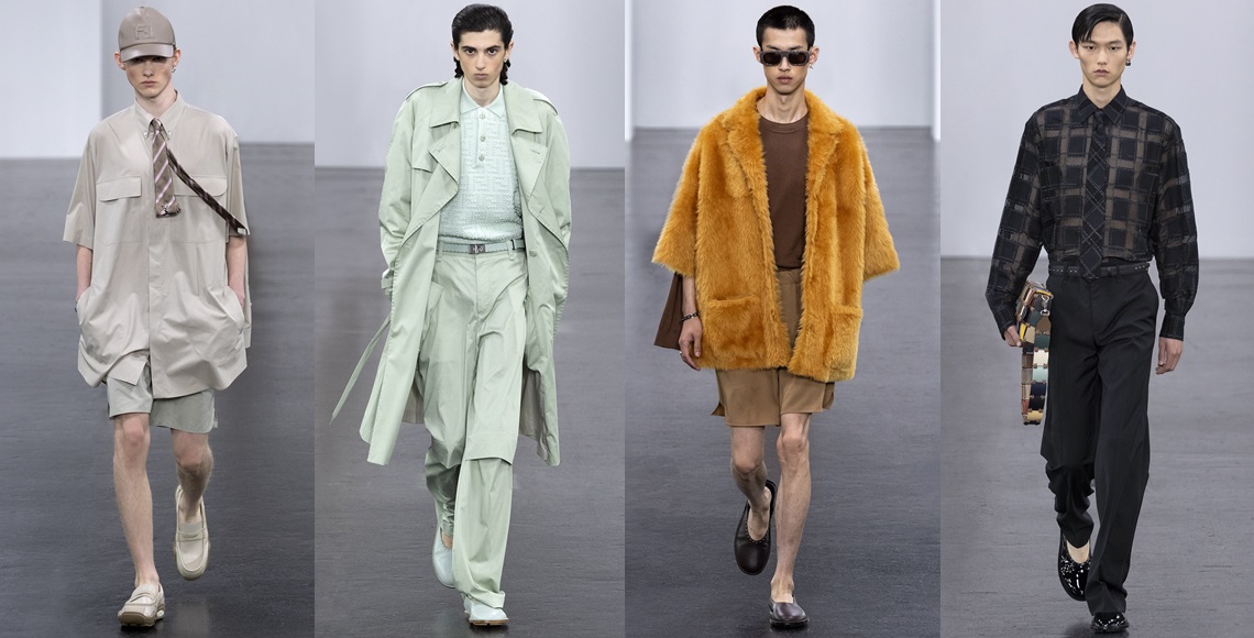 Bagi Silvia Venturini Fendi, rumah mode keluarganya adalah sebuah kapsul waktu di mana kerajinan Italia menjadi bintang utamanya. Visinya akan maskulinitas kontemporer disampaikan dengan palet mineral seperti mist, ivory, karamel, buttermilk, soft blues, dan forest green. Sebuah coat-of-arms Fendi Club memetik inspirasi dari emblem komunitas olahraga. Konsep seragam diinterpretasikan untuk style kerja maupun bersantai. Teknik Selleria yang diturun-temurunkan di keluarga Fendi dapat Anda temukan pada broken pinstripe suiting jacquard, permukaan Japanese boro denim, hingga tas-tas Peekaboo ISeeU Soft dan Baguette Double.