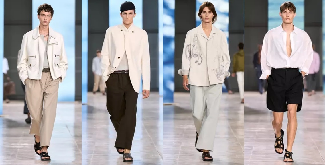 Untuk musim panas, kode utama Zegna adalah linen. Dalam koleksi “Us, in the Oasi of Linen”, Alessandro Sartori bereksperimen dengan bentuk, pendirian, dan tekstil-tekstil yang mengekspresikan individualitas. “Light pieces with a playful ease” is the vocabulary. Siluetnya lembut, santai, dan nyaman. Jaket “Il Conte” hadir dalam versi sleeveless, sementara t-shirt-nya bisa digunakan sebagai luaran. “Linen is a wonderful medium in this sense: Oasi Lino is not only traceable and true to our commitment to sustainability, but it is also as malleable and sensual as the idea of summer dressing we are prompting.” tambah Sartori.