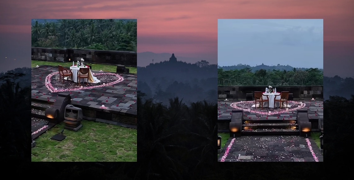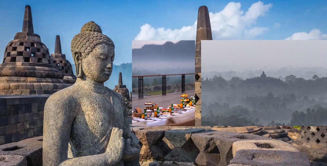 Kala sarapan di rooftop restoran, suasana menjadi lebih dramatis. Siluet arsitektur sang mandala kosmik nan estetik berbaur dengan langit dan kabut sebelum fajar terbangun. Aneka pastri dan roti tersaji, pesanan English Breakfast sedang dibuat, jus jeruk segar kami tuang ke gelas. Betapa menakjubkan menikmati makan pagi sembari memandangi pusat pendidikan masa peradaban kuno yang dibangun oleh Samaratungga dari Wangsa Syailendara beragama Buddha Mahayana; yang sekaligus merupakan monumen “pengukuhan” pamor politik atas rivalry dengan Dinasti Sanjaya berkepercayaan Hindu Siwa (keduanya sama-sama berkuasa di Kerajaan Medang atau Mataram Kuno).