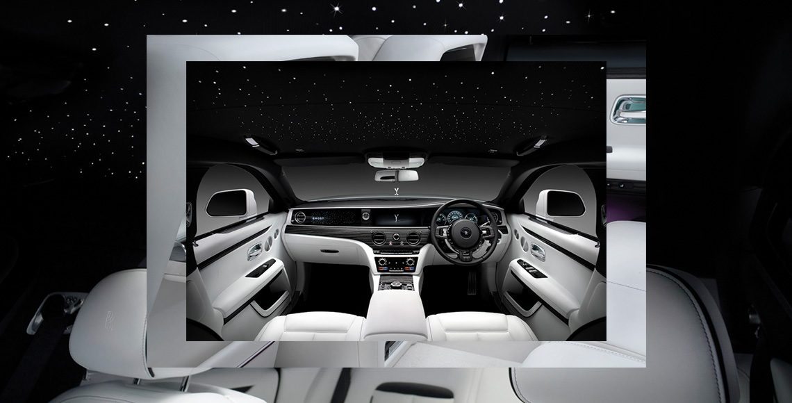 Ruang dalam kendaraan semakin istimewa berkat kehadiran Illuminated Fascia di dashboard. Bagian dashboard itu penuh kilau 850 bintang di sekitar nameplate ‘Ghost’. Butuh waktu 2 tahun melalui teknik rumit untuk mengembangkan aksen menawan ini. Illuminated Fascia padu serasi dengan Starlight Headliner yang sudah terlebih dahulu menghias kreasi-kreasi Rolls-Royce. Tampilan kemilau bintang-bintang di langit-langit mobil ini pun semakin hidup dengan dilengkapi 8 shooting stars (whenever you are in Rolls-Royce, you could always wish upon the shooting stars).