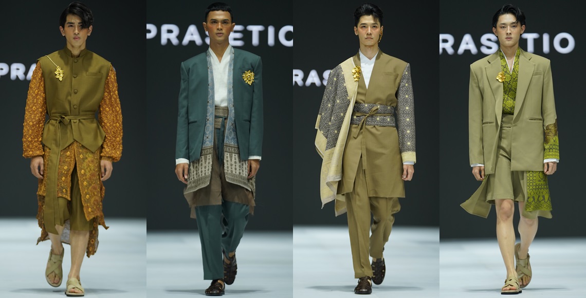 Temma tampaknya khusyuk bermain dalam pengkomposisian songket di rancangan-rancangannya. Pada sebuah look, lengan kanan dan kiri dibuat dengan songket berbeda. Di look lain, songket diolah maksimal menjadi sebuah atasan tanpa lengan yang dikencangkan dengan belt. Untuk sebuah jas berkerah kimono dengan lenggan berbahan songket, kain senada tersampir di pundak. Beberapa kreasi atasan berbahan songket, pinggangnya dipotong hingga menjadi cropped blazer. The most magical one for us is when he decorates a mac coat of songket with frills. Temma kian menunjukkan kelihaiannya dalam memformulasi proporsi estetis dari penggunaan kain-kain tradisi Nusantara dalam rancangan-rancangannya yang dinamis dan progresif.