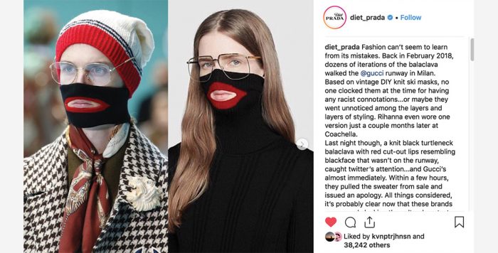 Berbanding terbalik dengan Dolce & Gabbana yang lamban mengambil tindak permintaan maaf atas kasus rasisme terhadap etnis Tiongkok pada beberapa waktu lalu – bahkan awalnya mereka bersikap defensif serta penuh drama – Gucci secara sigap merespon insiden kreasi turtleneck ala balaclava yang menyerupai wajah orang kulit hitam (menurut creative director Alessandro Michele sesungguhnya karya itu merupakan tribute untuk performance artist Leigh Bowery). Selain langsung merilis surat permohonan maaf secara resmi dan mencabut produk terkait dari pasaran, Gucci yang diwakili oleh CEO Marco Bizzarri pun intens dan terbuka membahas isu ini di hadapan khalayak umum. “We apologized because of this mistake, because of this ignorance,” ucapnya kala mengisi Marvin Traub Lecture di The New School’s Parsons School of Design New York, 13 Februari 2019.