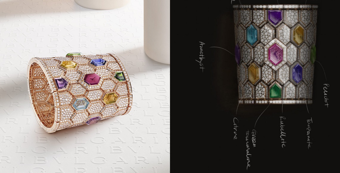 Permata-permata 9 warna yang digunakan ialah amethysts, citrines, aquamarine, rubellite, Chrome tourmaline, tanzanite, dan peridot. Bebatuan indah itu dikelilingi oleh scales bertatahkan 4.000 set diamonds. Desainer-desainer perhiasan Bulgari bekerjasama dengan tim gemologist untuk mencapai tingkat warna bebatuan yang vibran. Proses penempatan batu-batu mulia itu menghabiskan waktu lebih dari 470 jam. Dial dari kreasi timepiece ini secara keseluruhan berhias berlian dan berselubung batu rubellite heksagonal transparan. Jam tangan cantik ini digerakkan oleh quartz movement yang padanya terdapat logo Bulgari.